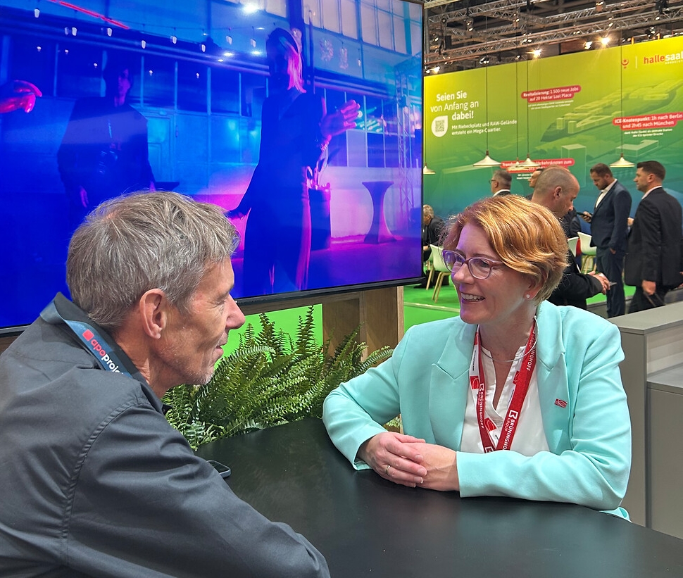 Katrin Berger, Business Development Managerin bei PLANSITE, im Austausch auf der Expo Real in München. FOTO: PLANSITE